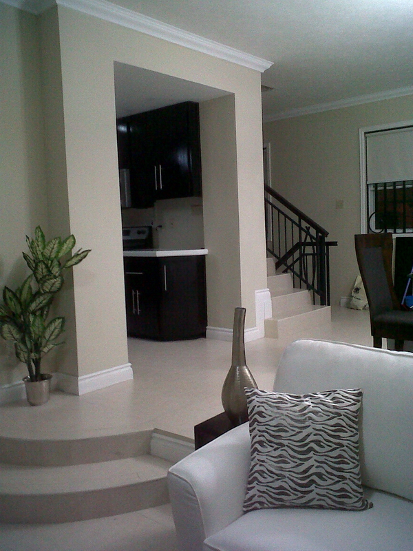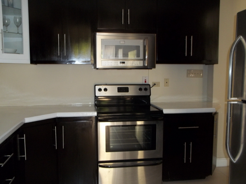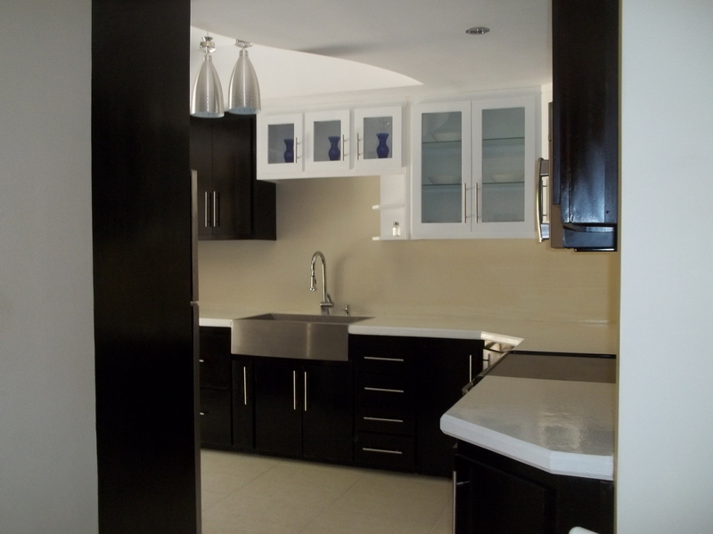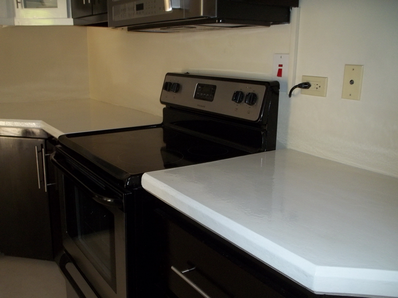 Contemporary kitchen, glossy white decorative concrete counter top over walnut hardwood cupboards, highlighted by white hardwood cabinets fitted with Docol Faucet (“Mangaire” – single lever design)